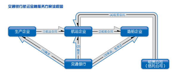 ● 船舶建造完成后,交通银行可携手交银租赁公司,共同为航运企业设计租赁方案,通过直接租赁、售后回租等方式帮助航运企业改善负债结构、降低融资成本;或联合交银信托公司,为航运企业及生产企业提供灵活的信托融资服务。