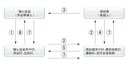 (2) 核心企业开户行审核后开立国内信用证,并通过供应商开户行通知供应商