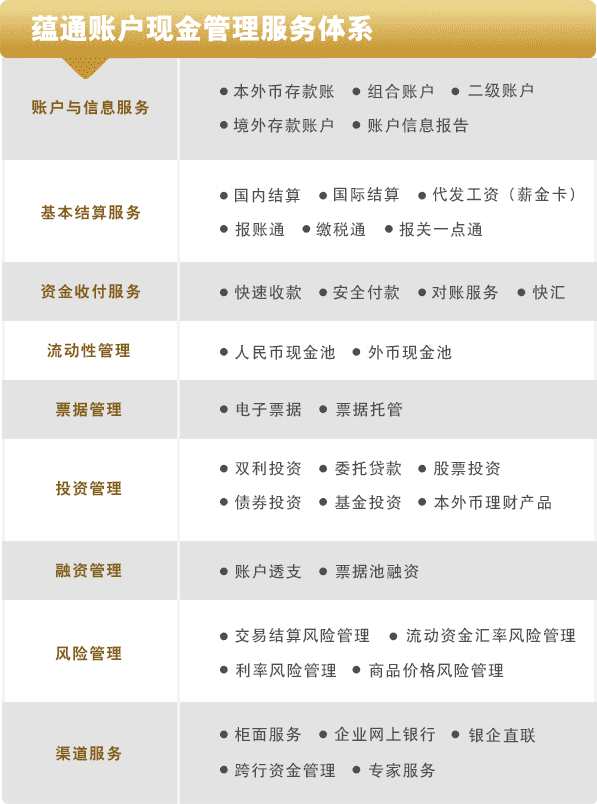 2007年,交通银行推出现金管理服务品牌—“蕴通账户”,针对企业客户在采购、生产、销售、投资、融资、集团管控等各个环节、各个领域的财资管理需求,以账户管理、收付款管理、流动性管理为核心,系统整合各项产品,为客户提供全方位、一站式的现金管理服务。目前,已有数千家企业成为蕴通账户的现金池用户,近十万家企业应用了蕴通账户的现金管理产品功能。 凭借强大的现金管理产品功能和良好的服务能力,交通银行赢得了许多优质现金管理客户的认可。
