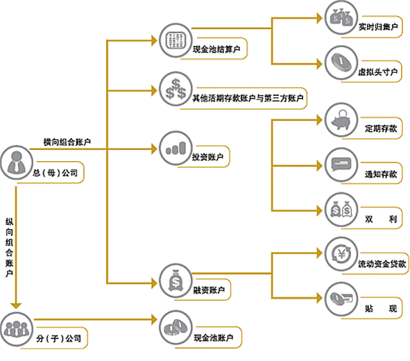“蕴通账户”中的组合账户功能模块为企业搭建合理的账户结构,集团总部在交行开立活期账户作为集团现金管理主账户;各子公司在交行当地分行开立活期账户,作为集团现金管理子账户,主账户与子账户之间按资金集中管理归属关系建立纵向关联关系。图示如下: