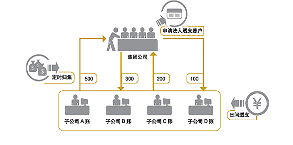 通过定时归集,集团公司每日日终统一上收各成员企业账户资金头寸,并集中到集团公司现金池主账户;集团公司统一向交行申请法人透支账户,并约定各子公司的日间透支额度;在约定的透支额度内,若日间子公司账户余额不足,由子公司开户行提供日间透支方式完成自主对外付款,并实时冻结集团公司现金池主账户资金。子公司开户行在日终直接从集团公司现金池主账户下拨资金归还子公司结算账户的日间透支额度,或由集团公司法人透支账户额度补足子公司结算账户的日间透支额度。